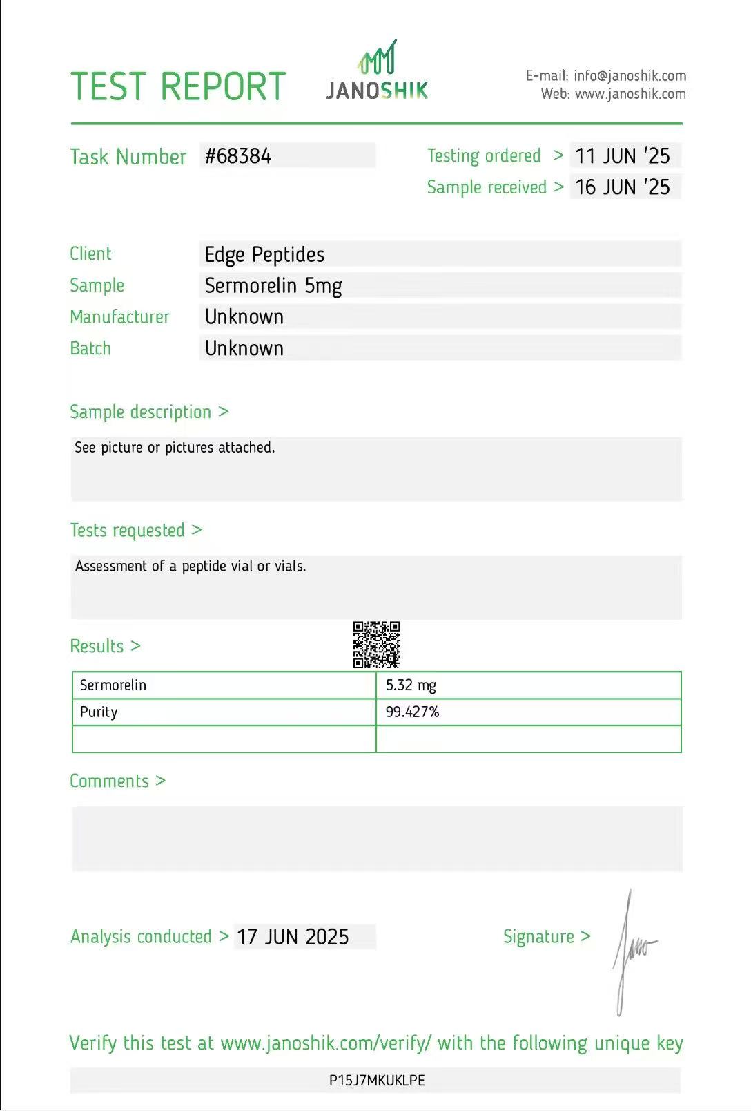 Our Sermorelin Acetate is sourced directly from a trusted Chinese manufacturer we have partnered with for years to ensure maximum potency and consistent quality. Each batch comes with an official COA (Certificate of Analysis) to verify purity and concentration.